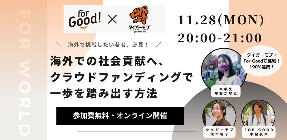 また、For Goodとタイガーモブは、2022年11月28日(月)にオンラインイベント「海外での社会貢献へ、 クラウドファンディングで 一歩を踏み出す方法| For Good×タイガーモブ 」を共催いたします。