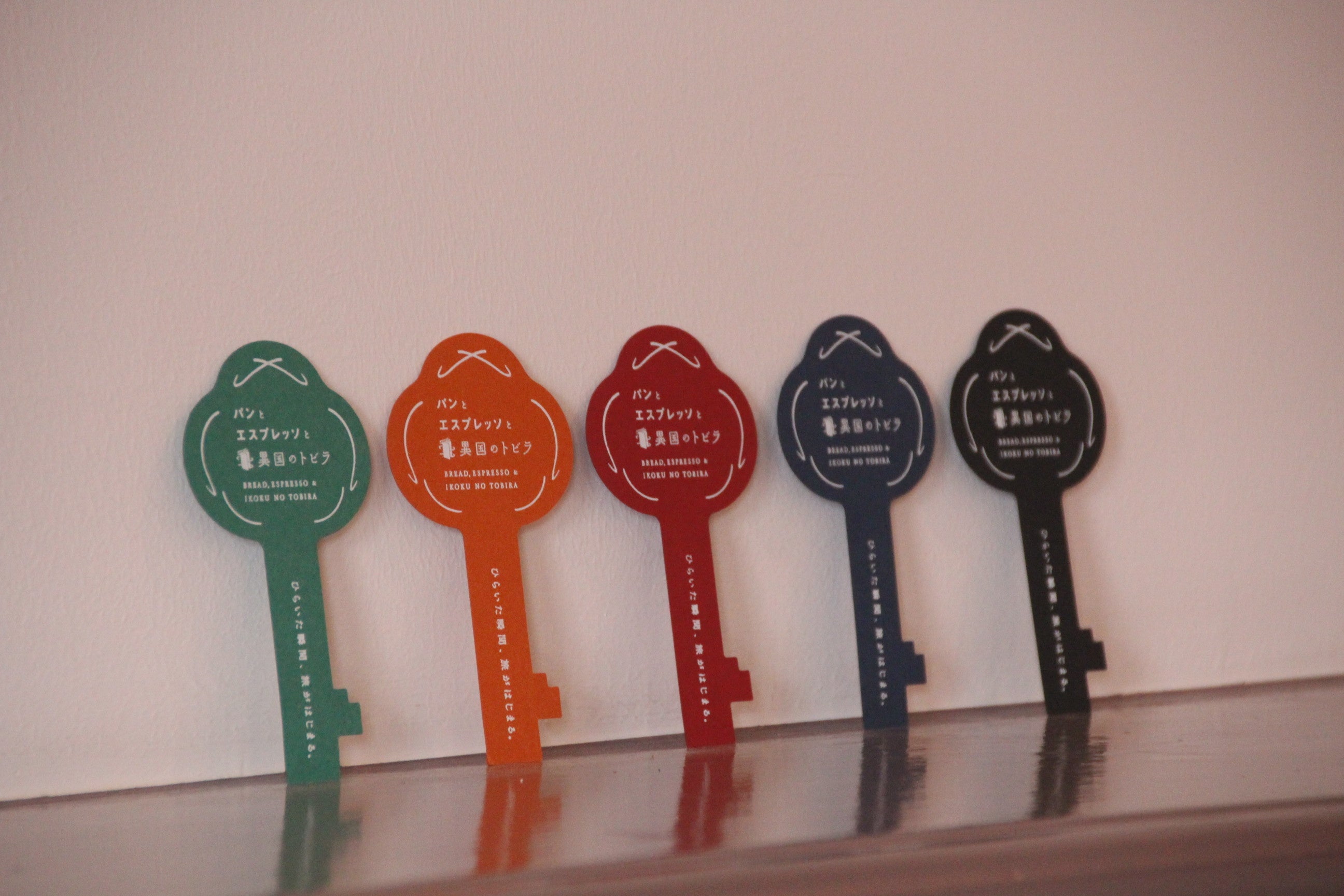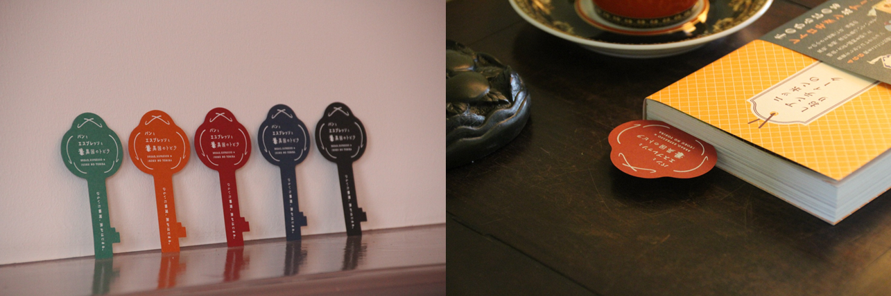 神戸北野異人館の1つである旧門兆鴻邸の2F部分に位置する「異国のトビラ」は、同店のコンセプト「異国情緒体感型書店」を体現するロゴやコピー、異人館の扉を再活用したオブジェ、異国情緒を感じられる本や雑貨のセレクト、内装のデザインなどが特徴です。日販は、ブックディレクションや選書などの本に関わる部分をはじめ、2F部分の事業設計からコンセプトおよびネーミングの策定、クリエイターアサイン、雑貨の選定、進行管理、運営サポートに至るまで、トータルでプロデュースしました。「異国のトビラ」は、1Fに同時オープンするベーカリーカフェ「パンとエスプレッソと異人館」のテイクアウト商品の持ち込みも可能とし、観光客の休憩スペースとしての空間も提供いたします。また、ご来館した記念のノベルティとして、鍵のしおり(全5種類)をプレゼントします。