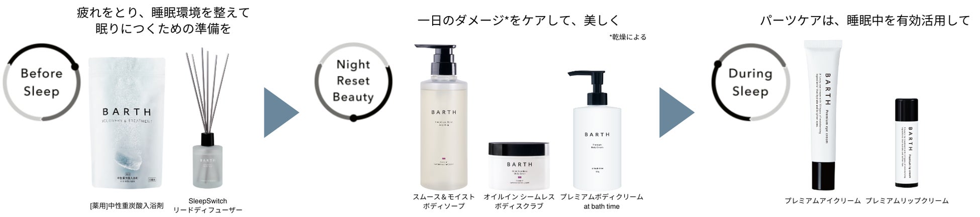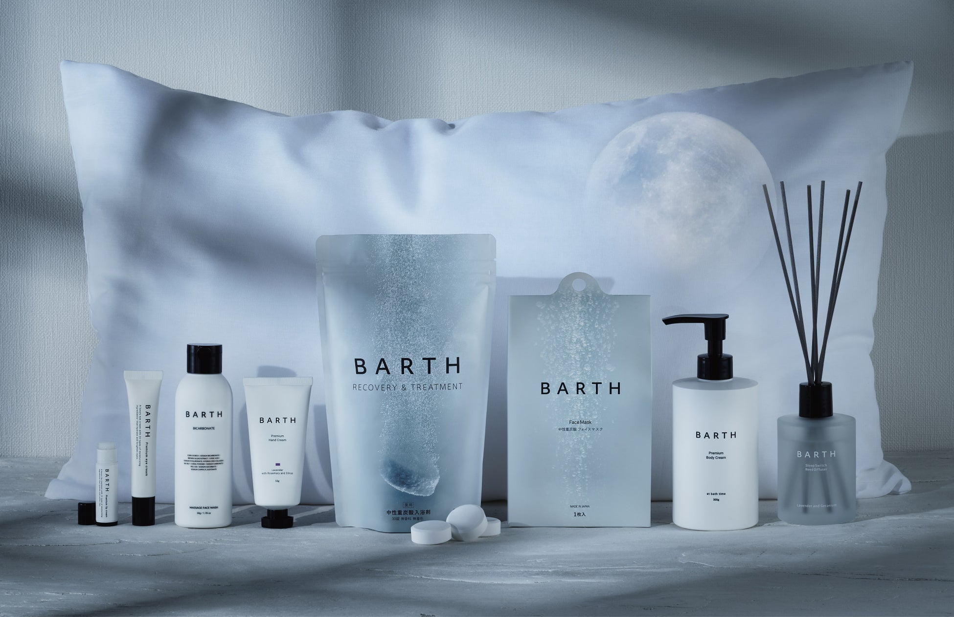 世界でも希少な中性重炭酸泉から着想を得た「薬用BARTH中性重炭酸入浴剤」をはじめとして、ナイトタイムを充実させるプロダクトを展開。“入浴”や“睡眠”といった何気ない日々の暮らしにワンエッセンス加えるだけで満たされる、プレミアムなナイトケア体験を提供します。