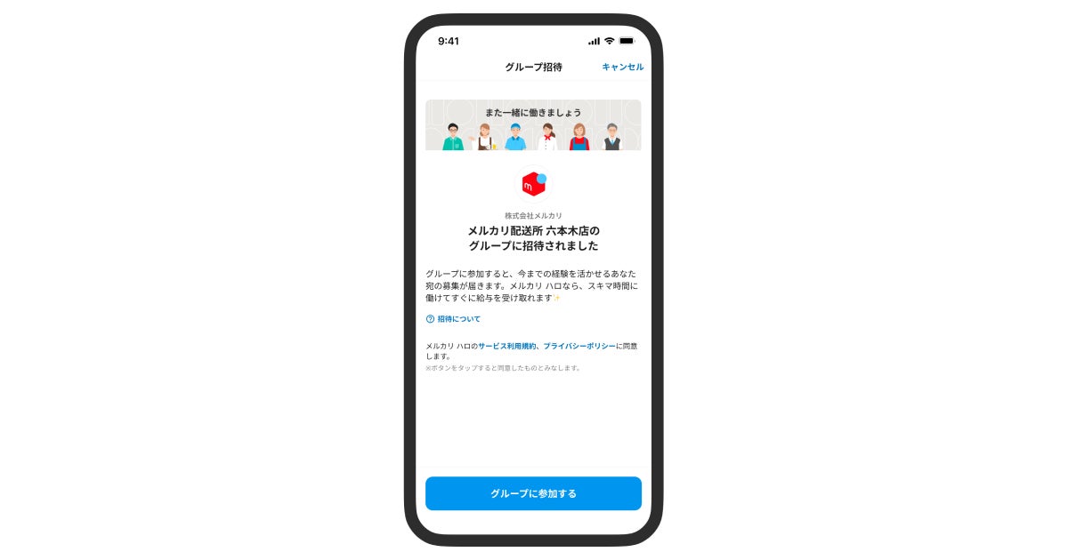 パートナーは、各店舗で過去に勤務経験があるOBOGに対し、「メルカリ ハロ」を通じた勤務経験を問わず、各店舗の「メルカリ ハロ」のグループに招待できるようになります。OBOGは、パートナーから送付(※4)される専用URLまたはQRコードから招待を任意で受け取り、簡単にグループ参加することができます。