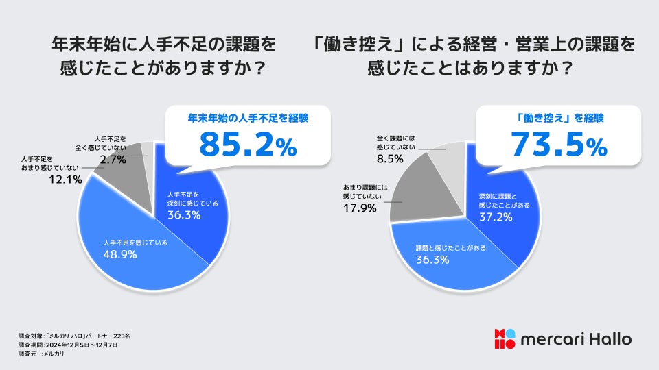 特に年末は、メルカリが実施した調査(※3)で、業界を問わず繁忙期であるにも関わらず、事業者の73.5%が「103万円の壁」などの年収の壁に起因する従業員の「働き控え」を経験しており、その結果、85.2%の事業者が年末年始に「人手不足の課題を感じたことがある」ことが明らかになりました。