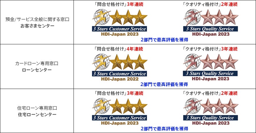 「問合せ格付け」については、カードローン専門窓口である「ローンセンター」が今回の受賞で4年連続、預金/サービス全般に関する窓口である「お客さまセンター」と、住宅ローン専門窓口である「住宅ローンセンター」が3年連続で三つ星を獲得しました。