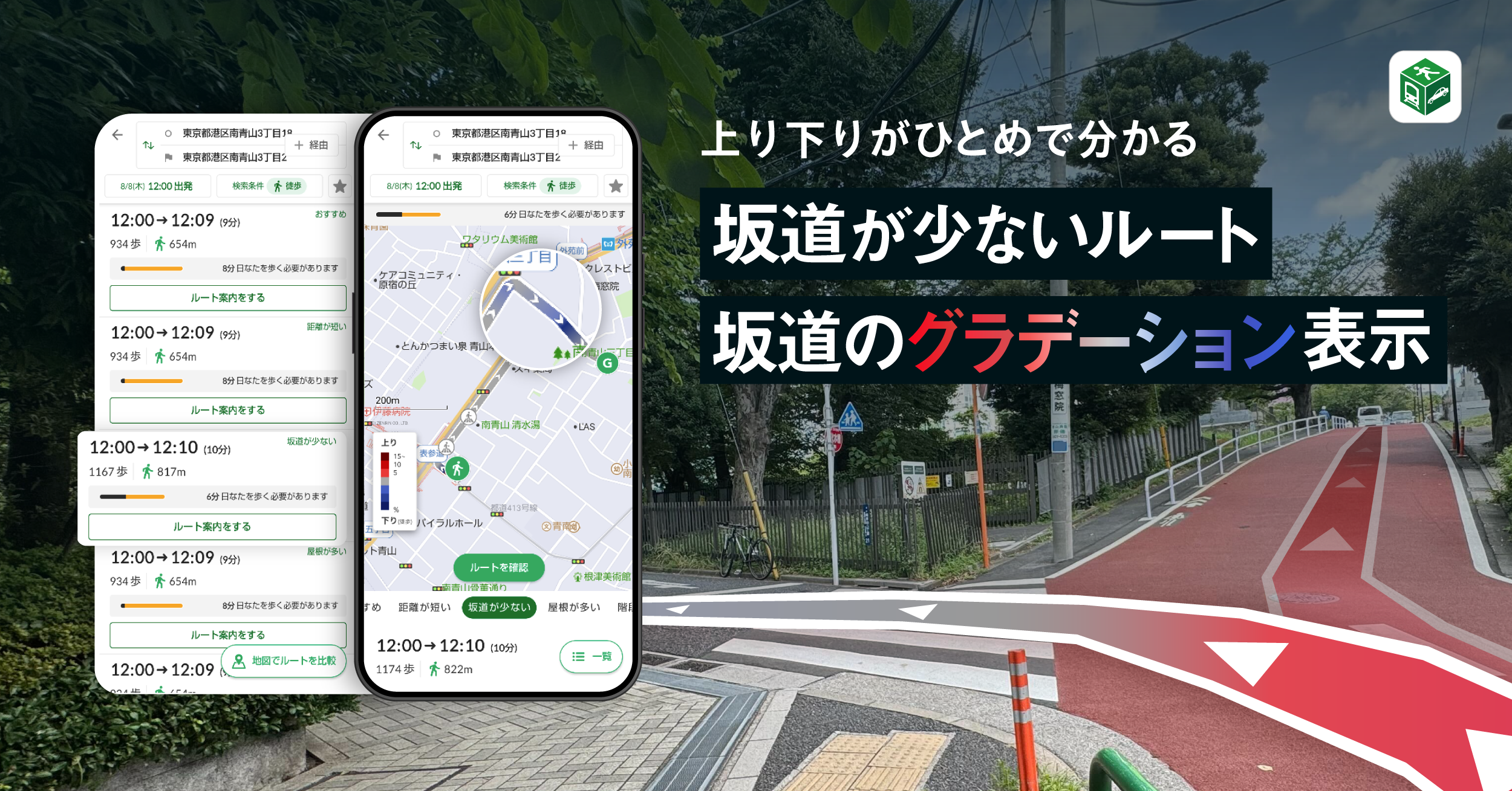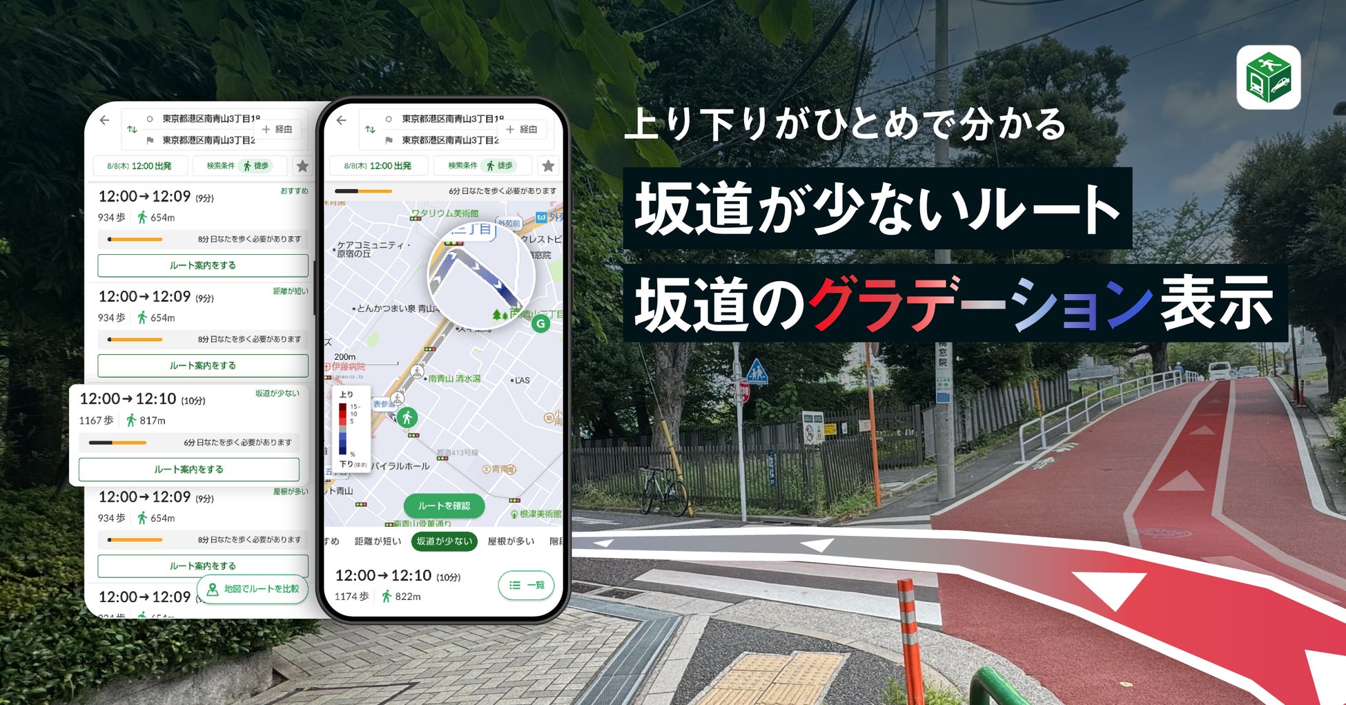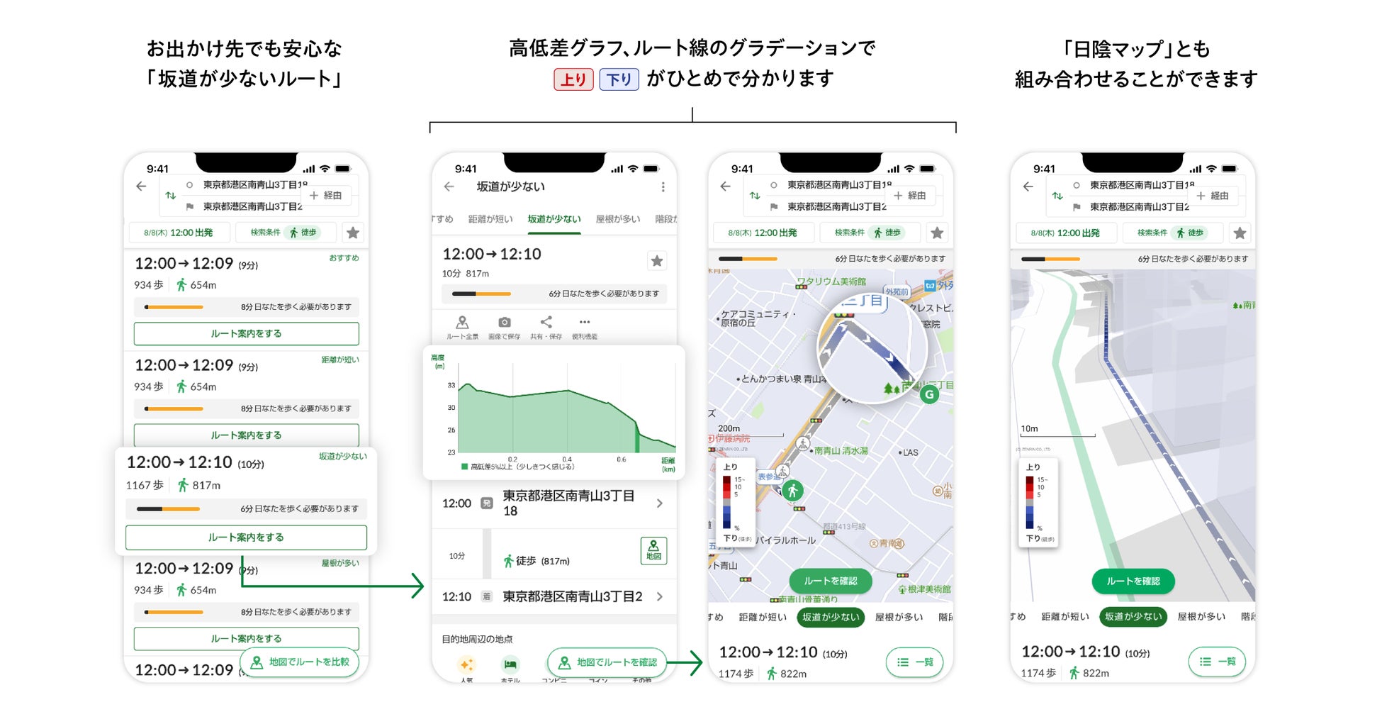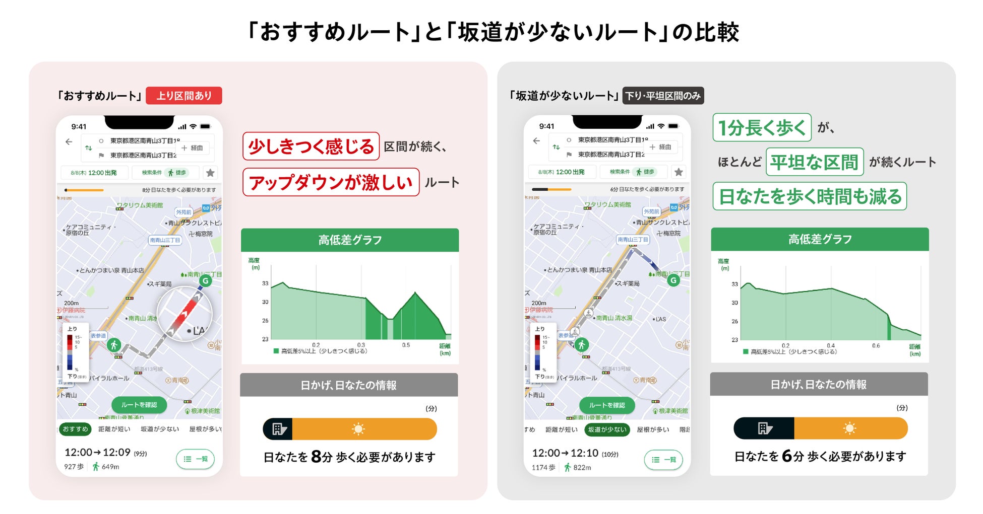 今回の対応により、通勤・通学などの日常生活や、旅行先、お出かけ先などの土地勘のない場所での移動など、少しでも坂道を避けたルートを探す際に便利にご利用いただけます。また坂道が苦手な方はもちろん、高齢者や体力に不安のある方、車いすやベビーカーを利用する方、大きな荷物を運ぶ方など、坂道を回避できるのか、急勾配はあるのか、などを事前に把握できるので、安心して移動していただけます。