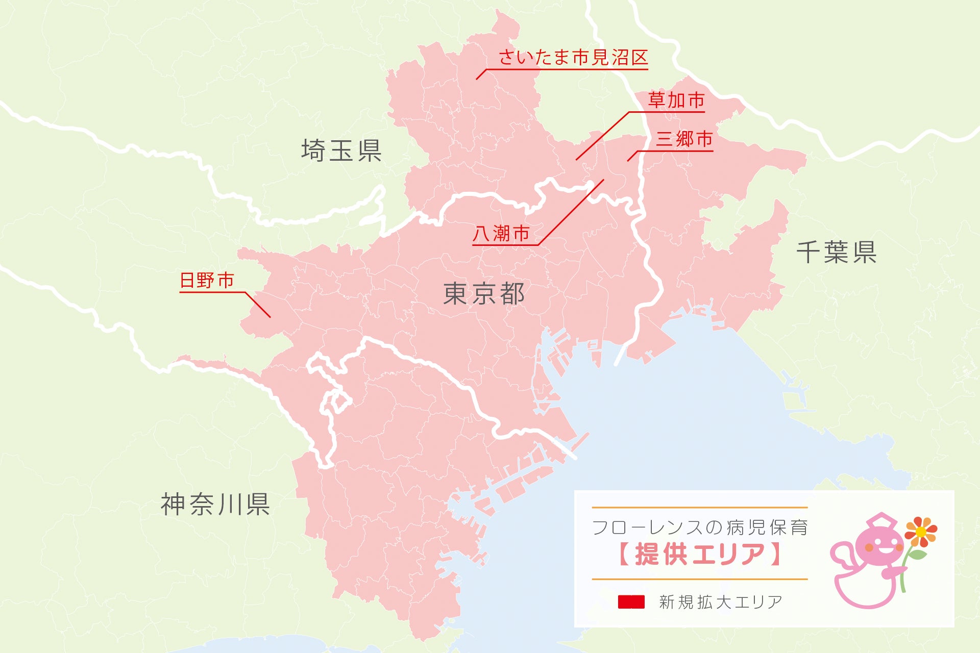 訪問型・共済型の病児保育を展開する認定NPO法人フローレンス(東京都千代田区、代表理事:赤坂緑)は、2026年4月1日より、新たに東京都日野市、埼玉県草加市、八潮市、三郷市、およびさいたま市見沼区の5エリアにおいてサービス提供を開始いたします。今回のエリア拡大は2021年以来、5年ぶりとなります。