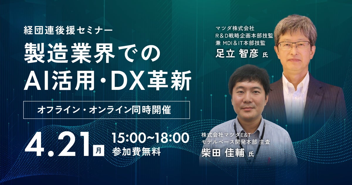 株式会社アイデミー(本社:東京都千代田区、代表取締役 執行役員 社長 石川聡彦、以下「アイデミー」)は、2025年4月21日に第3回経団連後援セミナー「製造業界でのAI活用・DX革新」を開催いたします。マツダ株式会社(本社:広島県安芸郡、代表取締役社長兼CEO 毛籠勝弘)と株式会社マツダE&T(本社:広島県広島市、代表取締役社長 清角肇)をゲストに迎え、DX人材の育成手法、実際の変革への結びつけ方、製造業のDX推進について共有いたします。