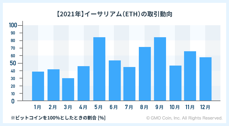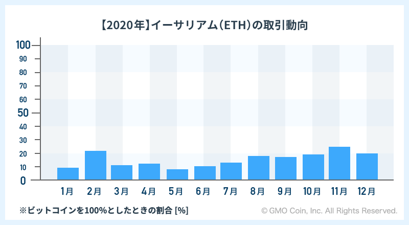 この結果を受け、1位となったイーサリアム(ETH)の取引動向を2020年から2021年まで、ビットコイン(BTC)との比較でご紹介します。なお、取引動向は販売所におけるビットコイン(BTC)の取引金額を100%としたときの割合(以下、対ビットコイン比率という)でご紹介します。