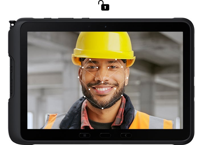画面タッチの感度※1調整をすれば、作業中、手袋をしたままでも操作が可能です。また、利用頻度が高いアプリをアクティブキーに設定することで、1回のタップでアプリを開くことができるため、簡単な操作でアプリを使用することが可能です。さらに、生体認証セキュリティが組み込まれているので、顔認証または指紋認証※2を利用したロック解除が可能です。顔認証を使用すれば、片手でも手袋をしていても簡単にロック解除が可能です。
