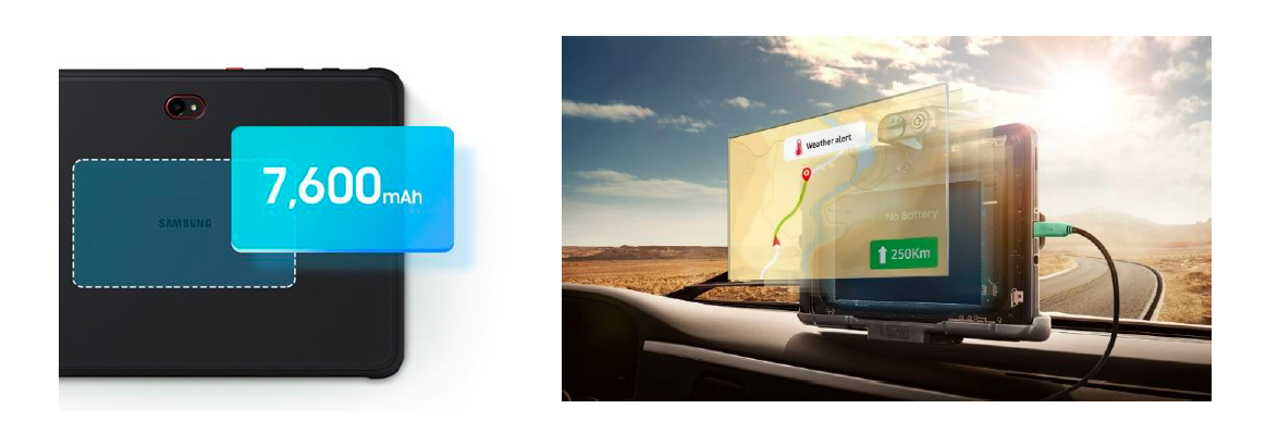 7,600mAhの大容量バッテリーを搭載しているため、屋外やコンセントが少ない場合でも長時間作業を続けることが可能です。また、「No Battery Mode」※1を利用すると、バッテリーを取り外しても、電源供給ケーブルの接続があれば、タブレットを利用することができます。温度が高い車内等でも端末の温度上昇を抑えるため、心配なく長時間ご利用いただけます。