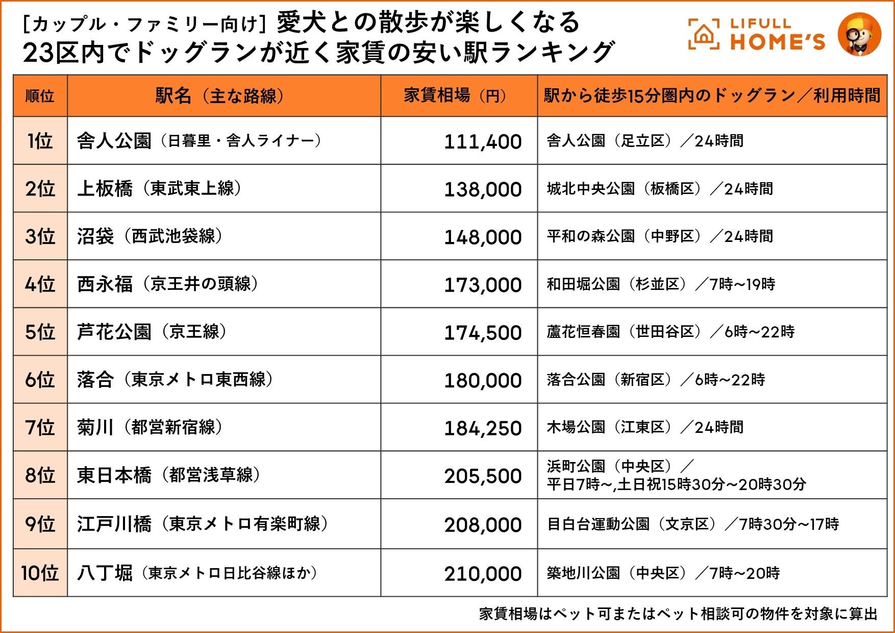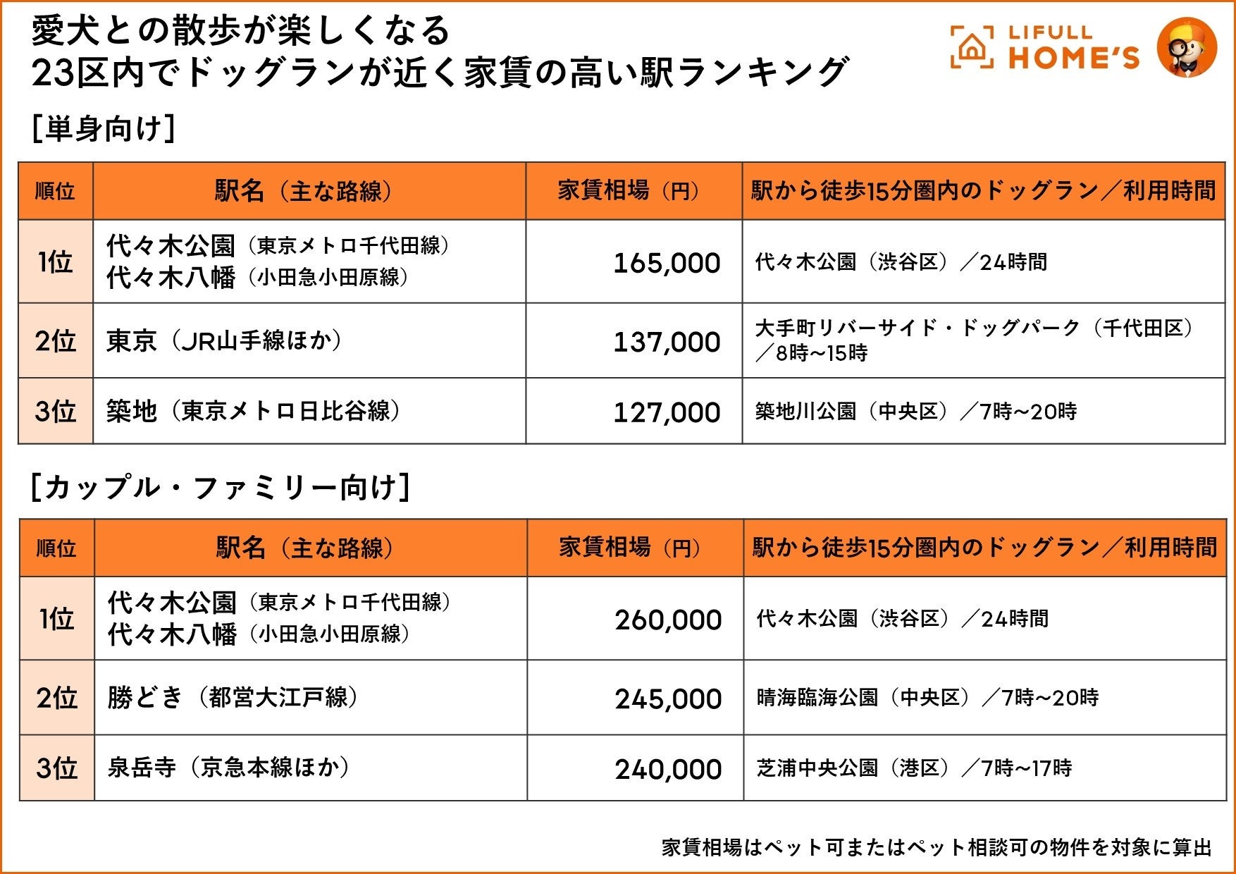 そこでLIFULL HOME'Sは、23区内にある無料で利用できるドッグランに近い駅※1を単身向け、カップル・ファミリー向けそれぞれのペット可またはペット相談可物件の賃貸物件の家賃相場が安い順にランキング化※2しました。