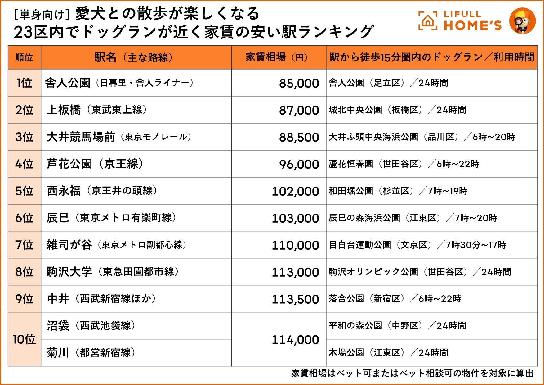 また、ペットを飼うにはお金がかかります。日々のお世話にかかる費用や保険費、医療費に加え、2023年2月のLIFULL HOME'S調べ※5では、東京都の単身者向け「ペット相談可」物件の平均家賃は98,804円、それ以外の物件の平均家賃は86,026円と、12,778円の差がありました。ゆとりある暮らしのためには、固定費はできるだけ抑えたいもの。そこで今回のランキングでは、「23区内でドッグランが近くにあり、かつ家賃が安い駅」の見える化を試みました。ランキング上位には舎人公園駅や上板橋駅など、都心部から30分前後の駅が並び、また、トップ10内には菊川駅や江戸川橋駅など、都心からほど近い駅もランクインしています。都内の利便性を享受しながら愛犬と健やかに暮らせる街として、住まい選びの一つの参考になれば幸いです。
