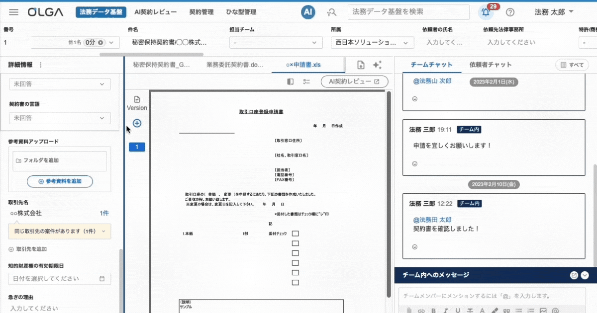 法務案件の管理において、参考資料と審査対象となる契約書の分類を誤ってしまうケースがあり、従来の「OLGA」では、ファイルの再アップロードによる分類の手間や、これによるバージョン管理および時系列での管理に支障が出てしまうという課題がありました。