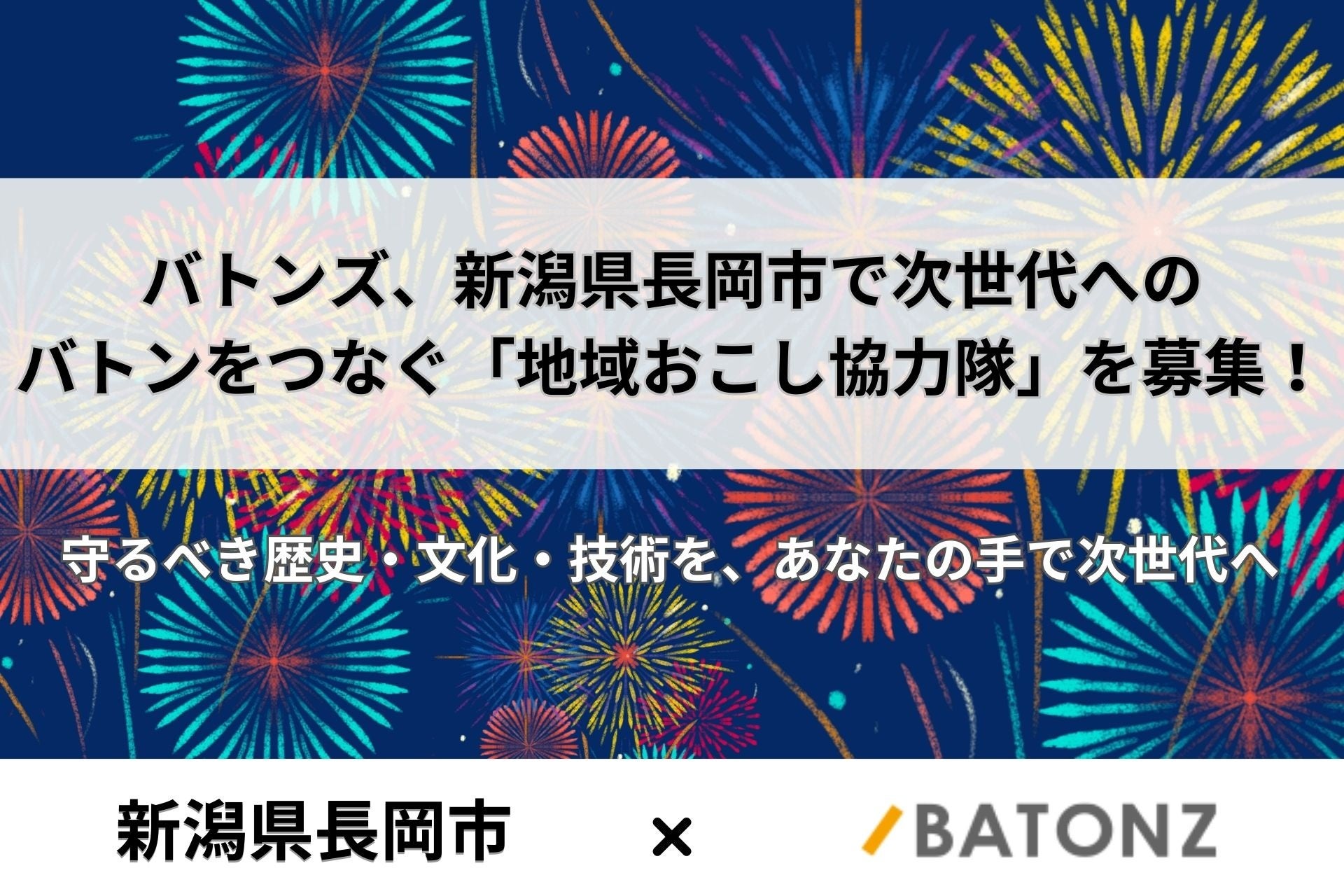 M&A・事業承継支援プラットフォーム「BATONZ(バトンズ)」を運営する株式会社バトンズ(本社:東京都中央区、代表取締役CEO:神瀬 悠一、以下バトンズ)は、新潟県長岡市で事業承継の架け橋となる「地域おこし協力隊」の募集を開始します。