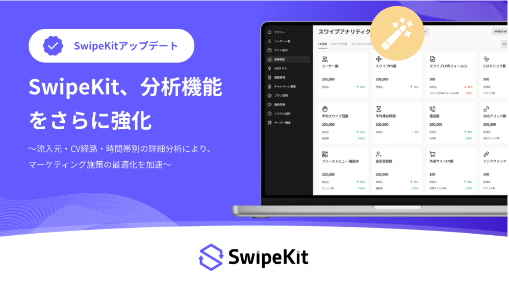 本機能強化により、マーケティング担当者はSwipeKit内で、流入の傾向把握から離脱ポイントの特定、施策実施前後の推移確認までを一連の画面で行いやすくなり、LP改善の意思決定と改善サイクルを円滑に回すことが可能となります。