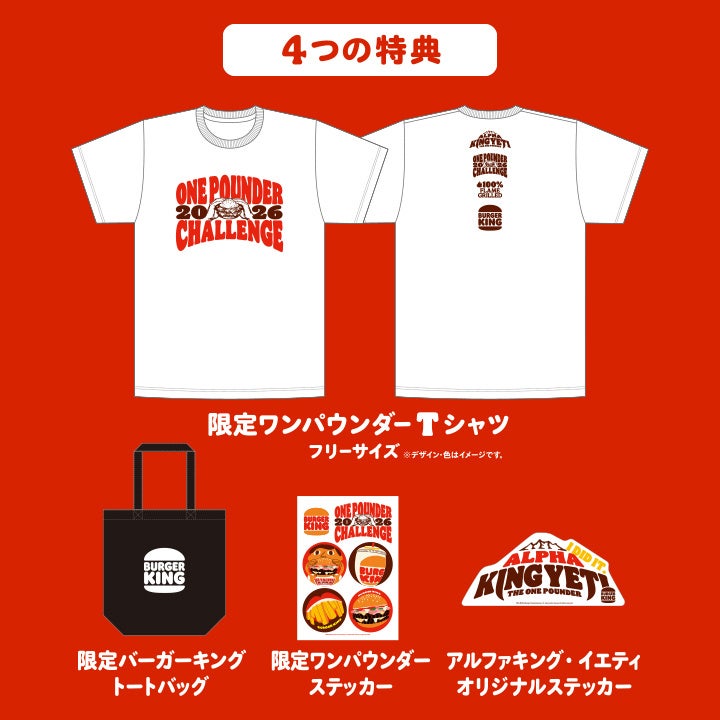 『ワンパウンダーチャレンジ2026』は事前の参加チケット購入が必要です。第1弾のチケットは3月18日(水)11時より、専用の参加チケット購入サイトにて販売を開始いたします。ご希望の店舗・日時を選択の上、ご購入ください。参加チケットの店頭での販売はございません。ご参加いただいた皆様には特典として、限定デザイン「限定ワンパウンダーTシャツ(1枚)」と「限定バーガーキング® トートバッグ(1個)」、「限定ワンパウンダーステッカー(1枚)」、「オリジナルステッカー(1枚)」をプレゼントいたします。