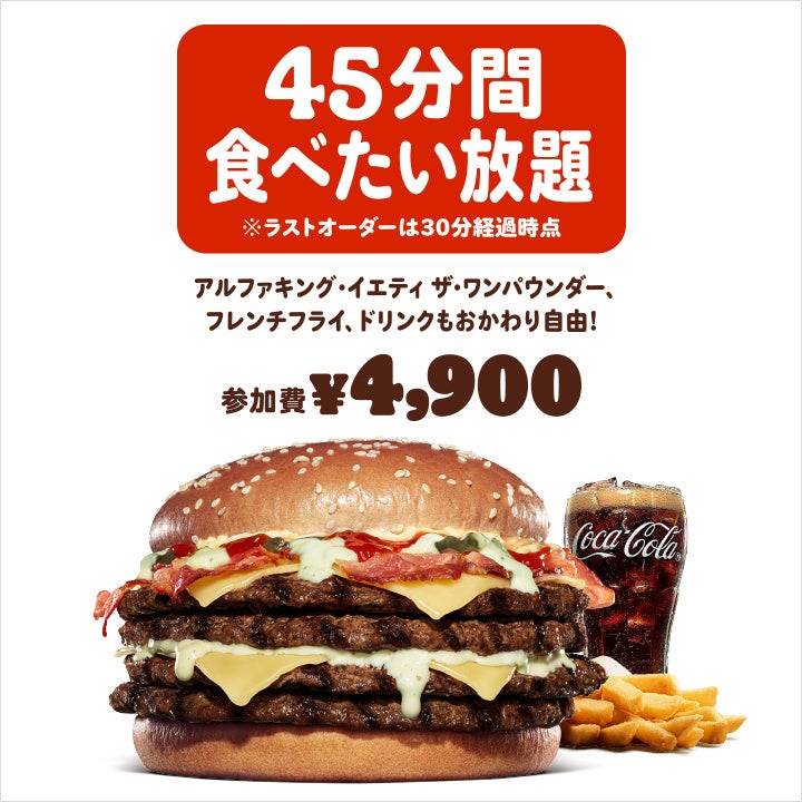 『アルファキング・イエティ ザ・ワンパウンダー』、フレンチフライ(S)、ドリンク(M)各商品を、それぞれ完食していることを条件に、いずれも制限時間45分以内でおかわり自由の食べたい放題イベントです。
