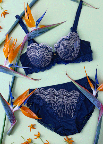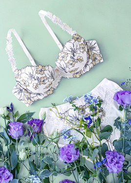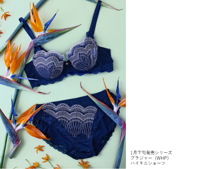 花の魅力は、フェミニンさだけではありません。凛とした強さもまた、美しさ。エキゾチックなカラーと花姿から極楽鳥花の和名がついたストレリチアの花のモチーフを、左カップのサイドに大胆にあしらいました。ブラジャー(WHP)は、締めつけ感の少ないフラットな幅広テープや、背中は折り返し仕様のメッシュテープで、やわらかな着けごこちに。リフトアップ効果の高いパターンを採用しています