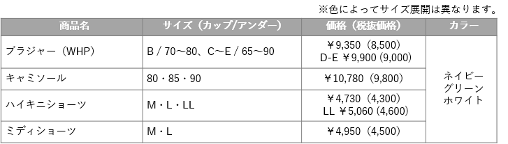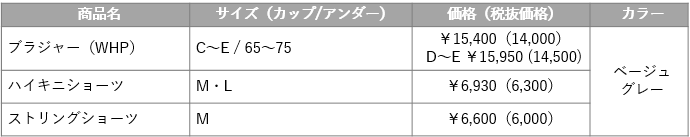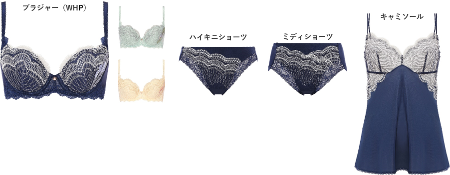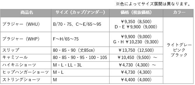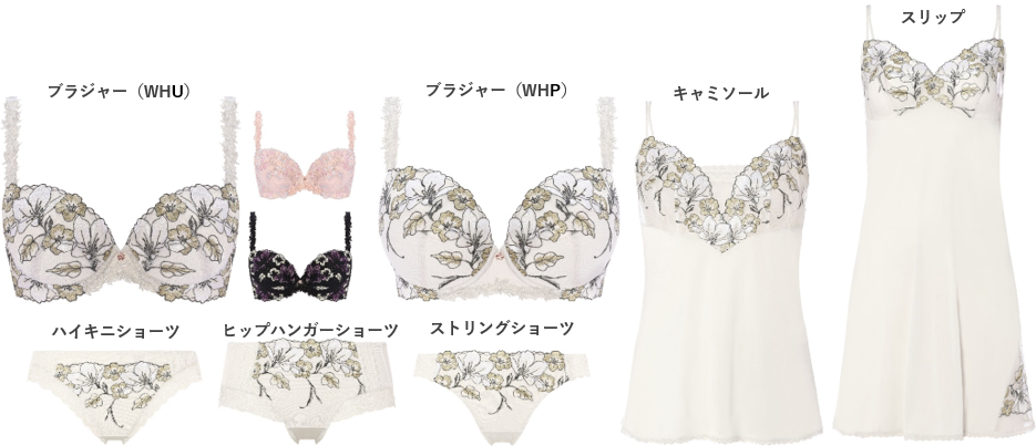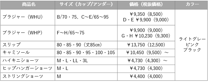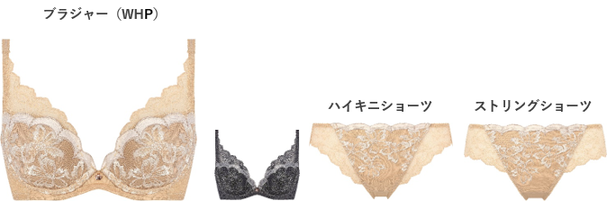 食い込みにくいNEWエンジェルワイヤーでやわらかい着けごこちながら、胸寄せ効果で谷間をきれいに魅せるB~Eサイズのブラジャー(WHU)と豊かなバストをすっきり自然なラインにメイクするF~Hサイズのブラジャー(WHP)をご用意しています。