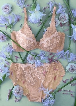 贅沢にクチュールライクな手法で、繊細に、贅沢に仕立てたチュール刺しゅうにうっとり。上品でシックなカラーに、高級感があふれるシリーズです。レースのモチーフになっているのは、花びらのニュアンスが美しいアマリリス。エレガントな優美さが、胸元で咲き誇ります。ブラジャー(WHP)は、センターが低め。サイドからバストを寄せて、きれいな谷間をメイクします。背部はストレッチレースをふんだんに使った、食い込みにくい仕様です。