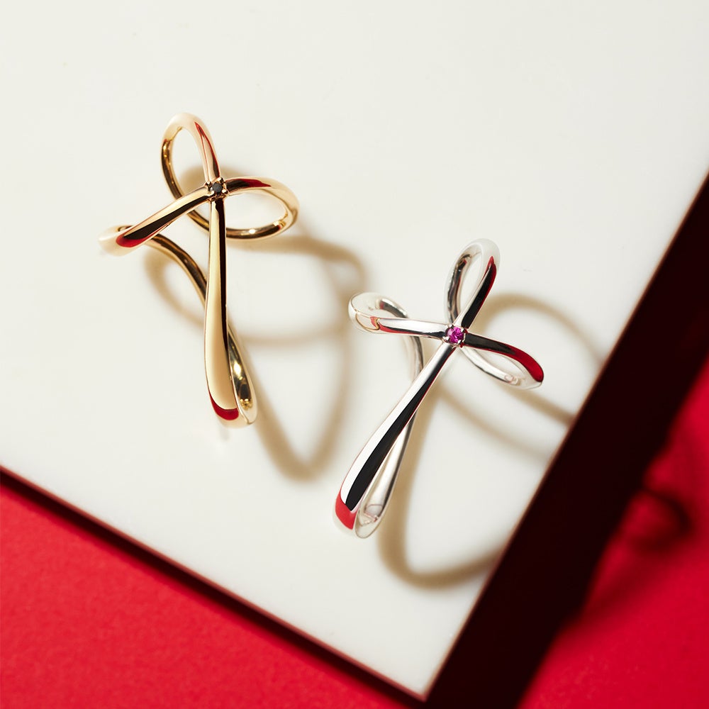 コレクションのスタートを飾るのは、コーディネートに確かな存在感をもたらすクロスモチーフのイヤーカフリング。