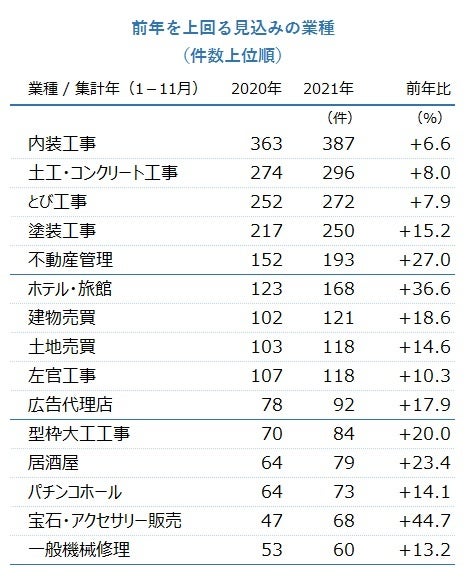 前年を上回る見込みの業種は、「内装工事」(387件)や「土工・コンクリート工事」(296件)など建設関係が上位。「ホテル・旅館」(168件)は過去10年で最多を更新する見込みとなる。「居酒屋」(79件)、「パチンコホール」(73件)も前年を大幅に上回る見込みとなる。
