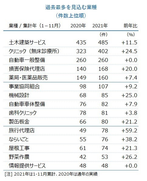 一方で、業種や業態によっては廃業件数が増加するなど、業種間で二極化の傾向がみられる。2000年以降で過去最多を見込む業種は、来院患者の急減といった影響を受けた「クリニック」(402件)が11月時点で初めて400件を突破したほか、「薬局・医薬品販売」(160件)、「歯科クリニック」(81件)など医療関係が上位。整備士不足が深刻化している自動車整備業関連のほか、旅行需要激減の影響を受けた「旅行代理店」(78件)などB to C系業種でも廃業の増加が目立つ。