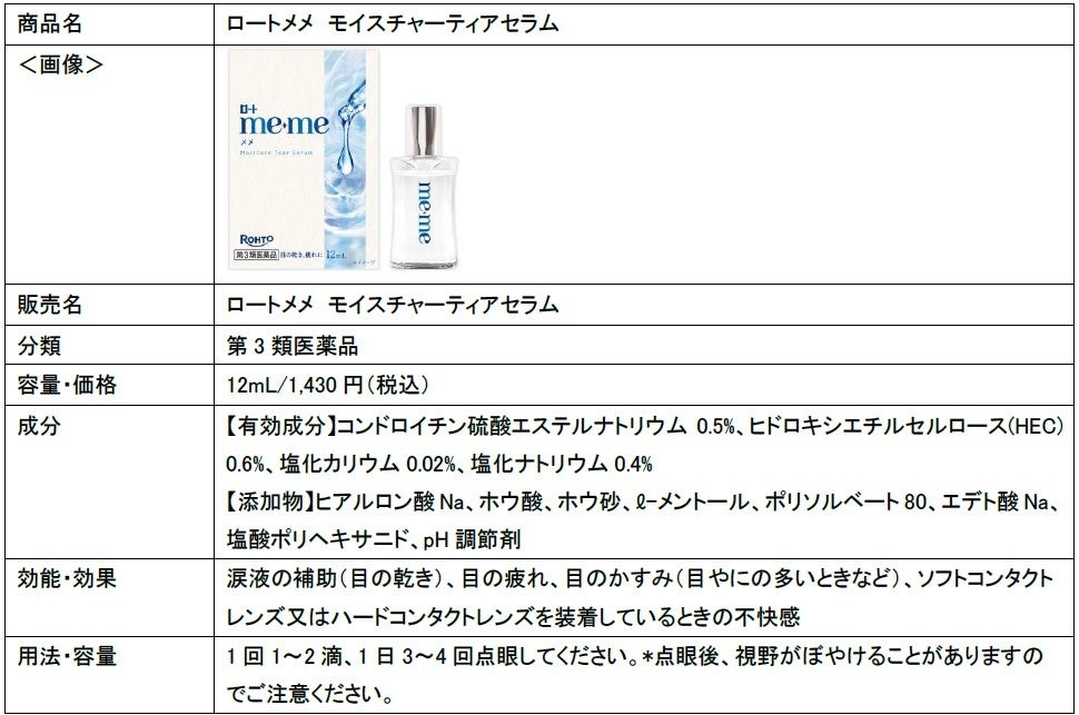 ロート製薬株式会社(本社:大阪府大阪市、社長:杉本雅史)は、この度目薬の新ブランド「ロートme+me」より「ロートメメ モイスチャーティアセラム」を新発売いたします。当社品比較で粘度約60倍※1のとろとろな製剤で、瞳に潤いの膜を張る保湿目薬です。また、これまで目薬を使ったことがない方々にも手にとっていただけるよう、まるでコスメのようなかわいらしい容器にもこだわりました。2024年11月28日(木)より一部先行発売を開始※2し、12月14日(土)より順次、全国のドラッグストアやECサイトにて発売いたします。