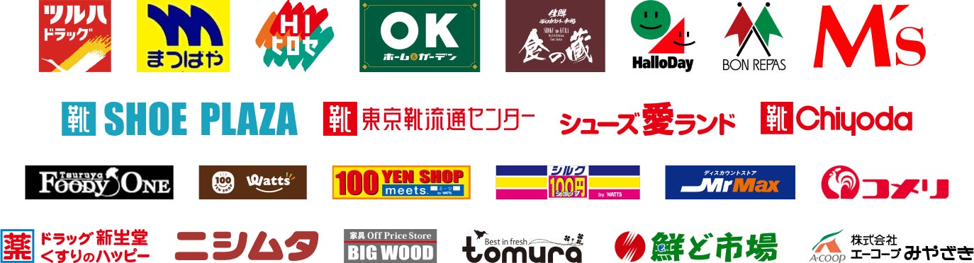 チヨダ、シュープラザ、 東京靴流通センター、ツルハドラッグ、シューズ愛ランド、ミスターマックス、鶴屋フーディワン、ワッツウィズ、meets 、シルク、コメリ ハード&グリーン 、コメリ パワー、ドラッグ新生堂、くすりのハッピー 、まつばや、HIヒロセ、OKホーム&ガーデン、食の蔵、ハローデイ、ボンラパス、エムズ、ビッグウッド、ニシムタ、スーパーとむら、鮮ど市場、エーコープみやざき