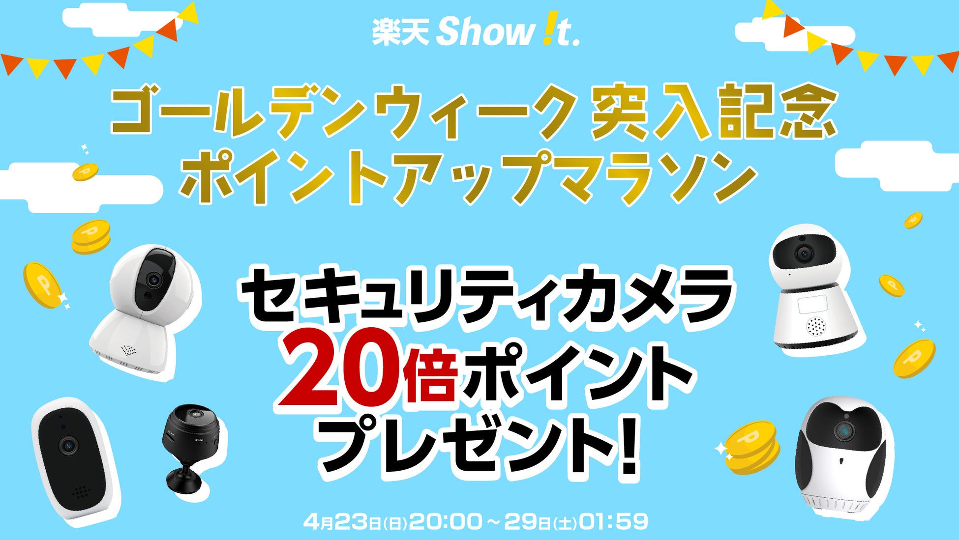 セキュリティカメラポイント20倍!楽天Show !t4月23日(日)開始、楽天お買い物マラソンに参加、配線不要で専用スタンドでどこでも設置可能なセキュリティカメラを含む全5種対象ポイント20プレゼント