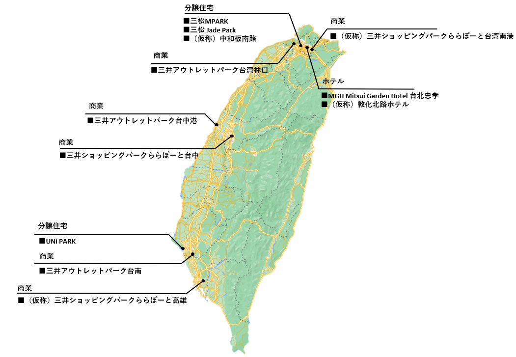 2016年に設立した現地法人(台湾三井不動産股份有限公司)を投資拠点として、台湾各地で商業施設事業、ホテル事業、および住宅事業の計11事業を推進しています。また物流施設、複合施設事業などの展開を目指し、今後も更なる事業の拡大をはかります。