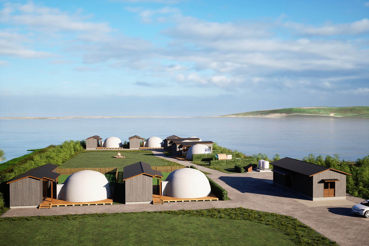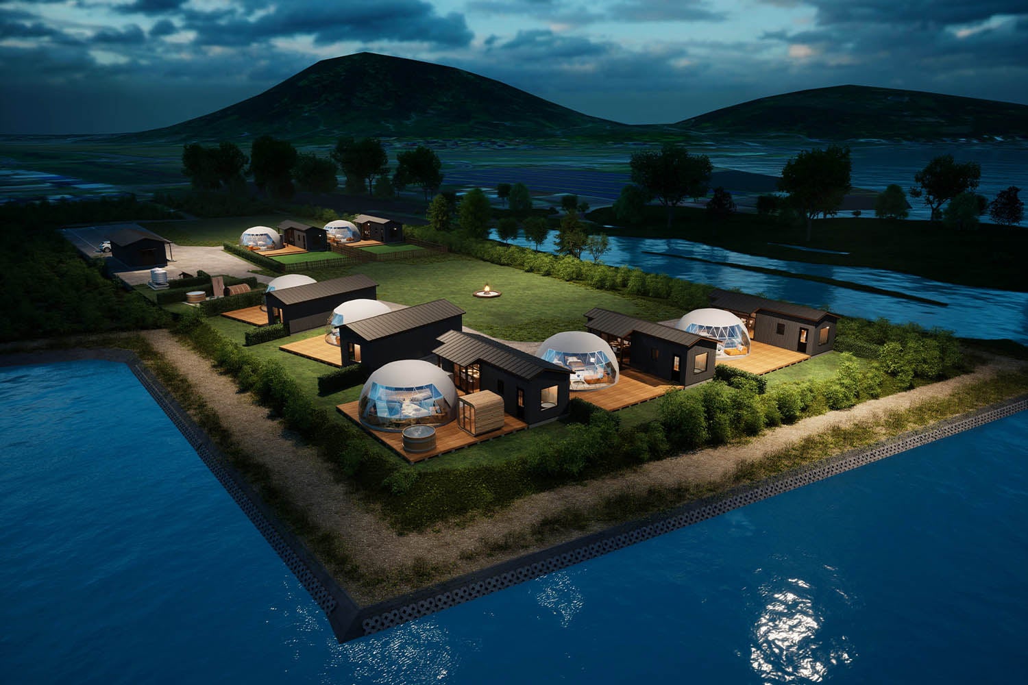 湖畔に佇む全7棟のドームテント。