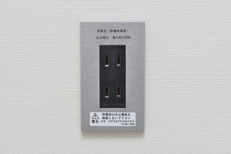 住戸内のリビングには太陽光パネルやエネファームから給電される停電時専用のコンセントを設置することで、停電時にも電力利用が可能※5です。また、本物件内の駐車場全13区画は太陽光発電・蓄電池と連携したEV充電区画となっており、非常時にはEV自動車から共用部照明等への電力の供給が可能なV2H(Vehicle to Home)設備を併設しています。