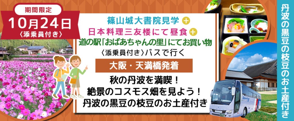 ※新商品※《丹波の黒豆お土産付き》10月24日(火) 【兵庫県・丹波】〈梅田・大阪駅・天満橋発着・添乗員付き〉 コスモス畑+篠山城大書院散策+ご昼食をご堪能+地元の農作物を買いに行こう 丹波の秋を感じる日帰りバスプラン