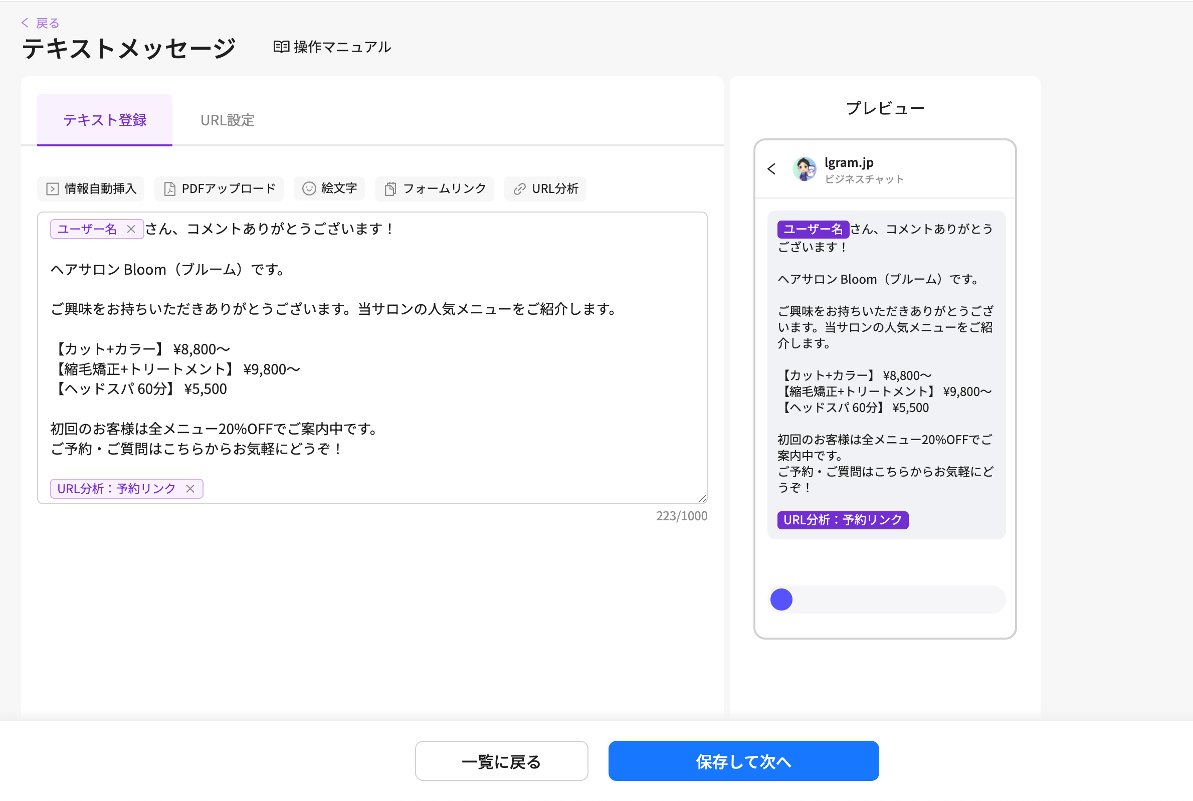 エルグラムのテンプレート機能は、あらかじめ作成したメッセージを保存し、自動応答やDM配信などさまざまな場面で呼び出せる機能です。