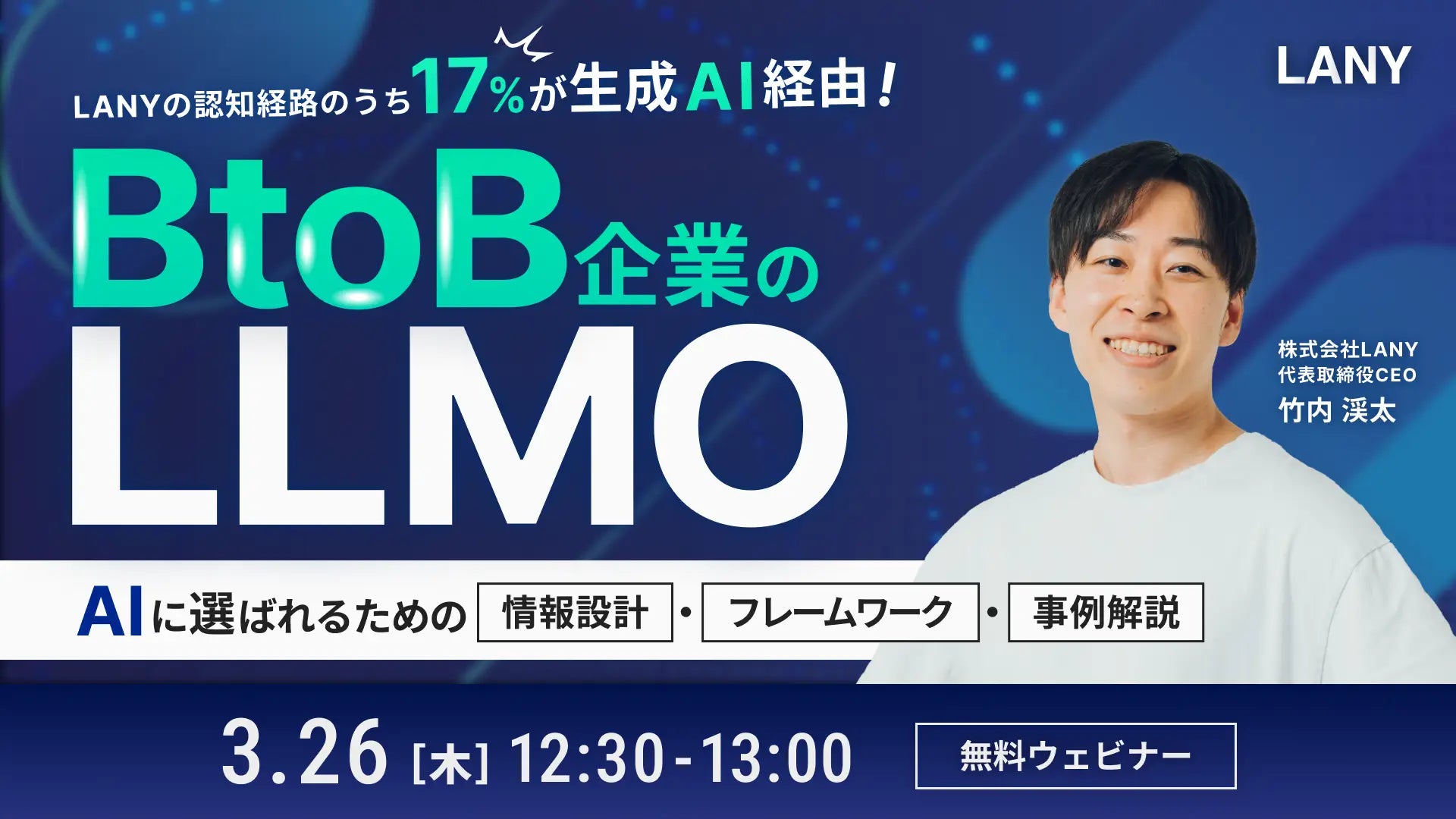 デジタルマーケティング支援を提供する株式会社LANY(東京都渋谷区、代表取締役社長:竹内渓太)は、【無料ウェビナー】BtoB企業のLLMO ━ 17%が生成AI経由で認知!AIに選ばれるための『情報設計』『フレームワーク』『事例解説』 を3/26(木)に開催いたします。