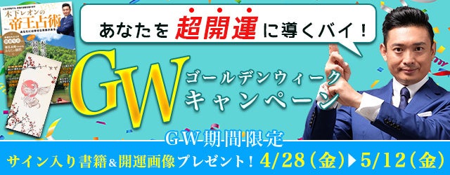 ゴールデンウィークは八十八夜、端午の節句、立夏と重要な日が連続して訪れる「超開運週」。そんな特別な時期に合わせて「木下レオンの占い」では、皆様に最高の幸運を掴んで頂くために、特製の開運画像と木下レオン直筆サイン入り書籍のプレゼントをご用意いたしました。