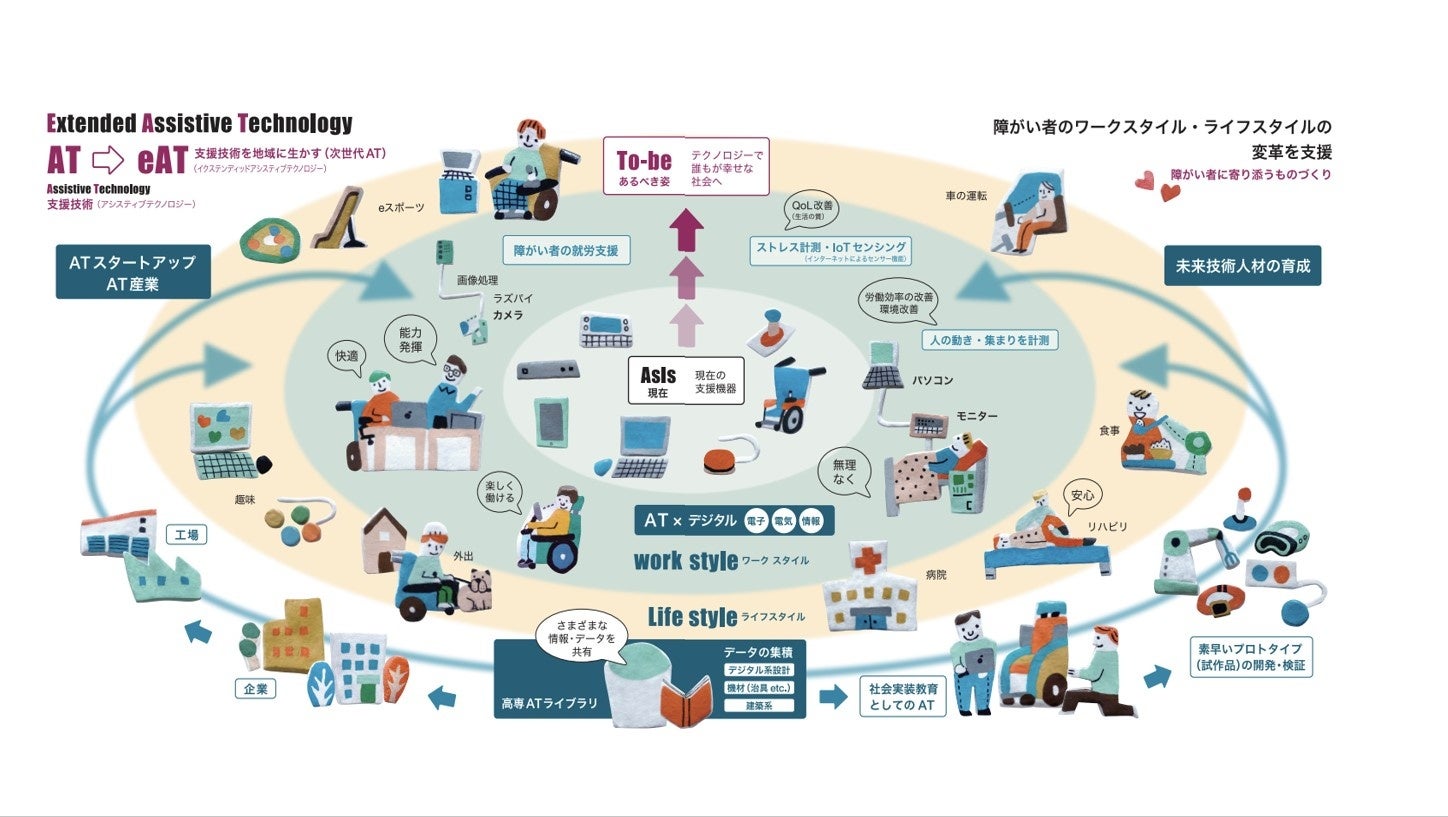 国立高専機構が立ち上げたGEAR5.0事業(未来技術の社会実装教育の高度化)における「介護・医工」分野では、中核拠点校である熊本高専と、協力校6校(函館・仙台・長野・富山・徳山・新居浜)を中心に、「持続可能な地域医療・福祉を支えるeAT-HUB構想とAT技術者育成による共生社会の実現」をテーマとして活動しています。