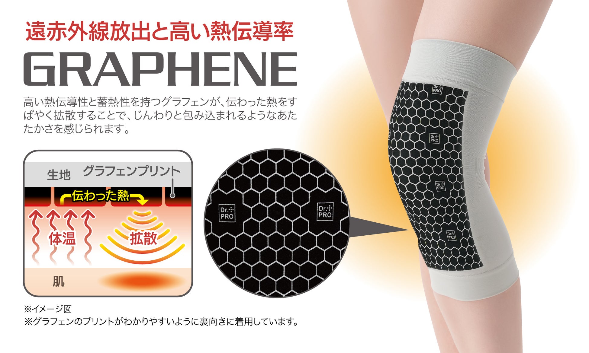 内側は特殊素材『GRAPHENE』をプリント!高い熱伝導率と蓄熱性により、ひざをじんわり温めながら、関節をサポートします。