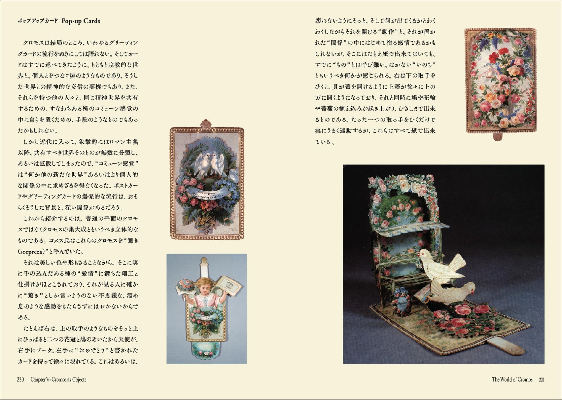 多色刷り石版印刷術の発明とともに生まれ、世紀末ヨーロッパの社交や趣味を美しく彩った印刷物「クロモス」。人々は花、子ども、天使、動物など多種多様なモチーフを精巧な印刷と加工でかたどったクロモスで手紙やグリーティングカード、お菓子、アルバムなどを飾り、友人や家族、恋人への思いを伝えました。しかし、このような流行もつかの間、クロモスは20世紀という時代の到来とともに時代遅れなものとして忘れさられていきました。本書はそんなクロモスの貴重なコレクション約800点を紹介したビジュアルブックです。