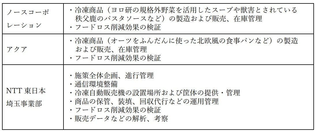 株式会社ノースコーポレーション(本社:埼玉県さいたま市/代表取締役 北 康信、以下「ノースコーポレーション」)、株式会社アクア(本社:埼玉県さいたま市/代表取締役社長 德永 奈美、以下「アクア」)および東日本電信電話株式会社 埼玉事業部(本社:東京都新宿区/執行役員事業部長 市川 泰吾、以下「NTT東日本 埼玉事業部」)は、冷凍自動販売機(ど冷えもん)を用いた飲食店グルメのシェアリング販売を通してフードロス削減効果の有用性を検証する実証実験を下記のとおり開始しました。