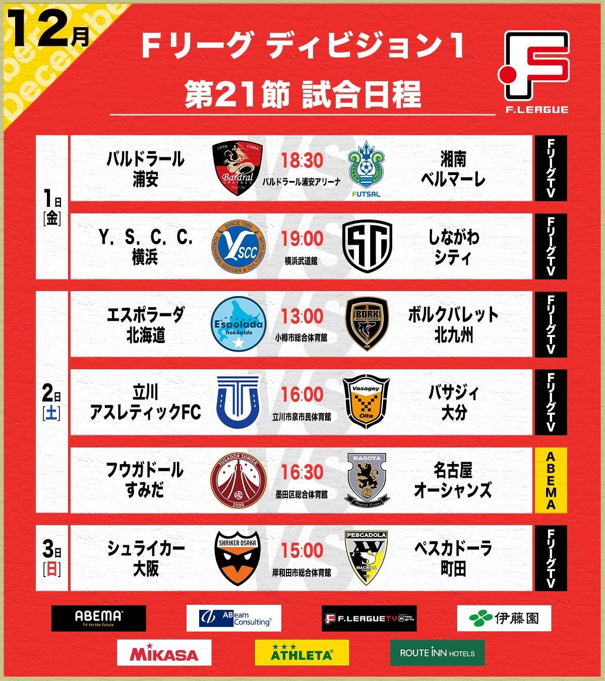 12月3日(日)15:00キックオフ シュライカー大阪 vs. ペスカドーラ町田