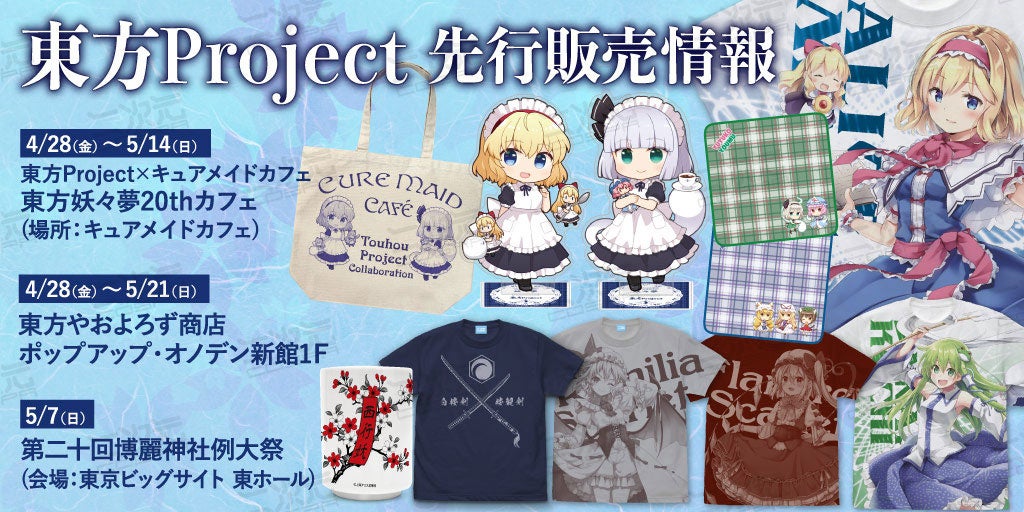これらは、4/28(金)~CURE MAID CAFÉ[オノデン本店4F ジーストア・アキバ内]で開催される〈コラボカフェ〉および、オノデン新館1Fで開催される〈東方やおよろず商店 ポップアップショップ〉、5/7(日)〈第二十回博麗神社例大祭〉での先行販売が決定いたしました。