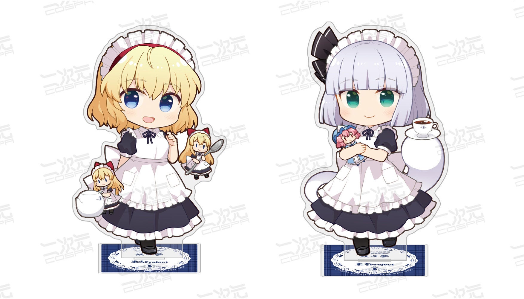 『東方Project』より、秋葉原のCURE MAID CAFÉ制服姿の魂魄妖夢、アリス・マーガトロイドの「アクリルスタンド」をはじめ、「フルグラフィックTシャツ」など新グッズが二次元コスパから登場です。