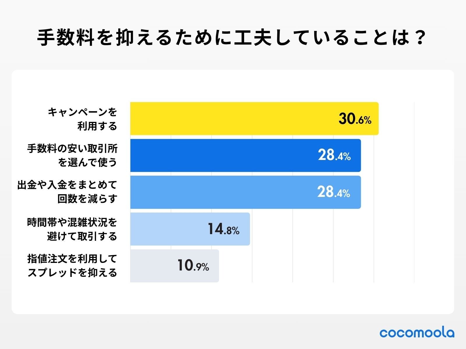 ・手数料を抑えるための工夫として「キャンペーンを利用する」(30.6%)が最も多く、「手数料の安い取引所を選んで使う」(28.4%)、「出金や入金をまとめて回数を減らす」(28.4%)が続いた。また、手数料が安いと感じた取引所は「Coincheck」(20.2%)が最多だった。