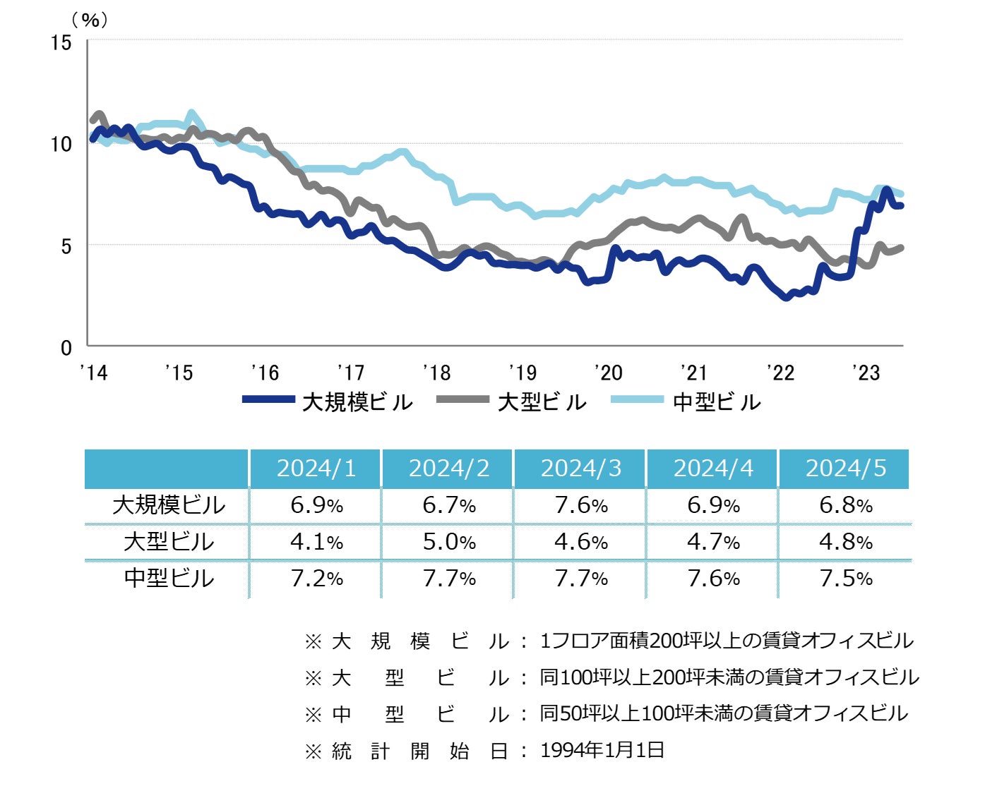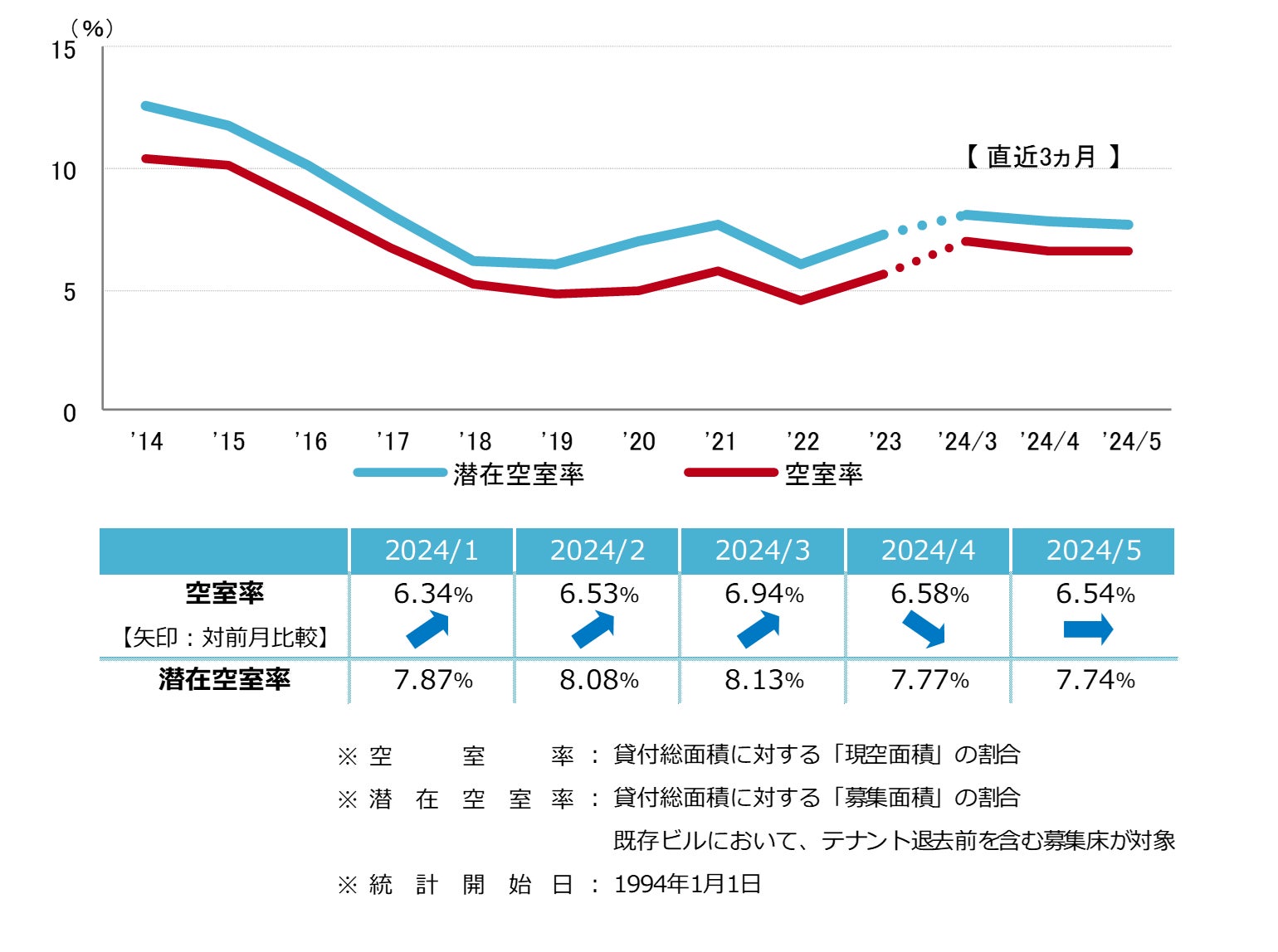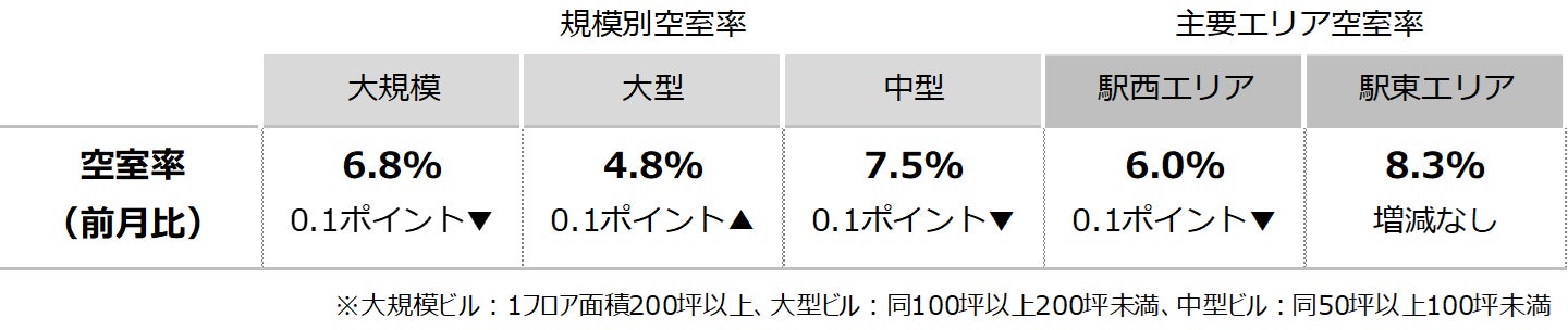 空室率は前月比マイナス0.04ポイントの6.54%となり、2ヵ月連続で低下した。自社ビルへの集約移転や部分解約により空室が生じた一方、新築ビルを中心に空室消化が進んでいる。潜在空室率は前月比マイナス0.03ポイントの7.74%だった。