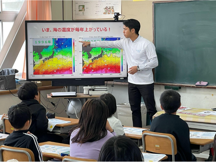 続いて、テレビ高知のお天気お兄さんとしても活躍する山岸拓 気象予報士は、「地球温暖化」をテーマに、日本の海の温度が過去100年で1.3℃上昇したという事実を基に、高知の海に及ぼす影響を解説しました 。