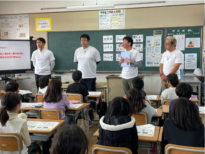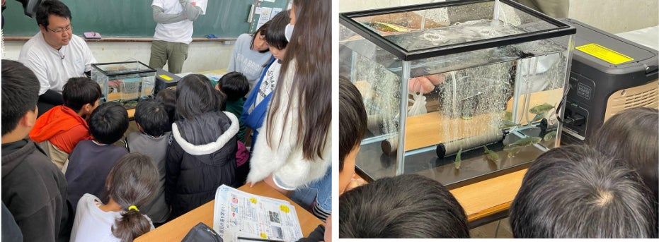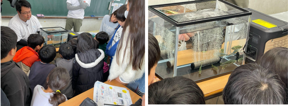授業では、実際に大学で養殖されているブリの稚魚「モジャコ」を教室に持ち込み、子どもたちに公開。活きた魚を間近で観察することで、研究者が行う「育てる漁業」の技術と、持続可能な食糧確保の重要性を学びました。