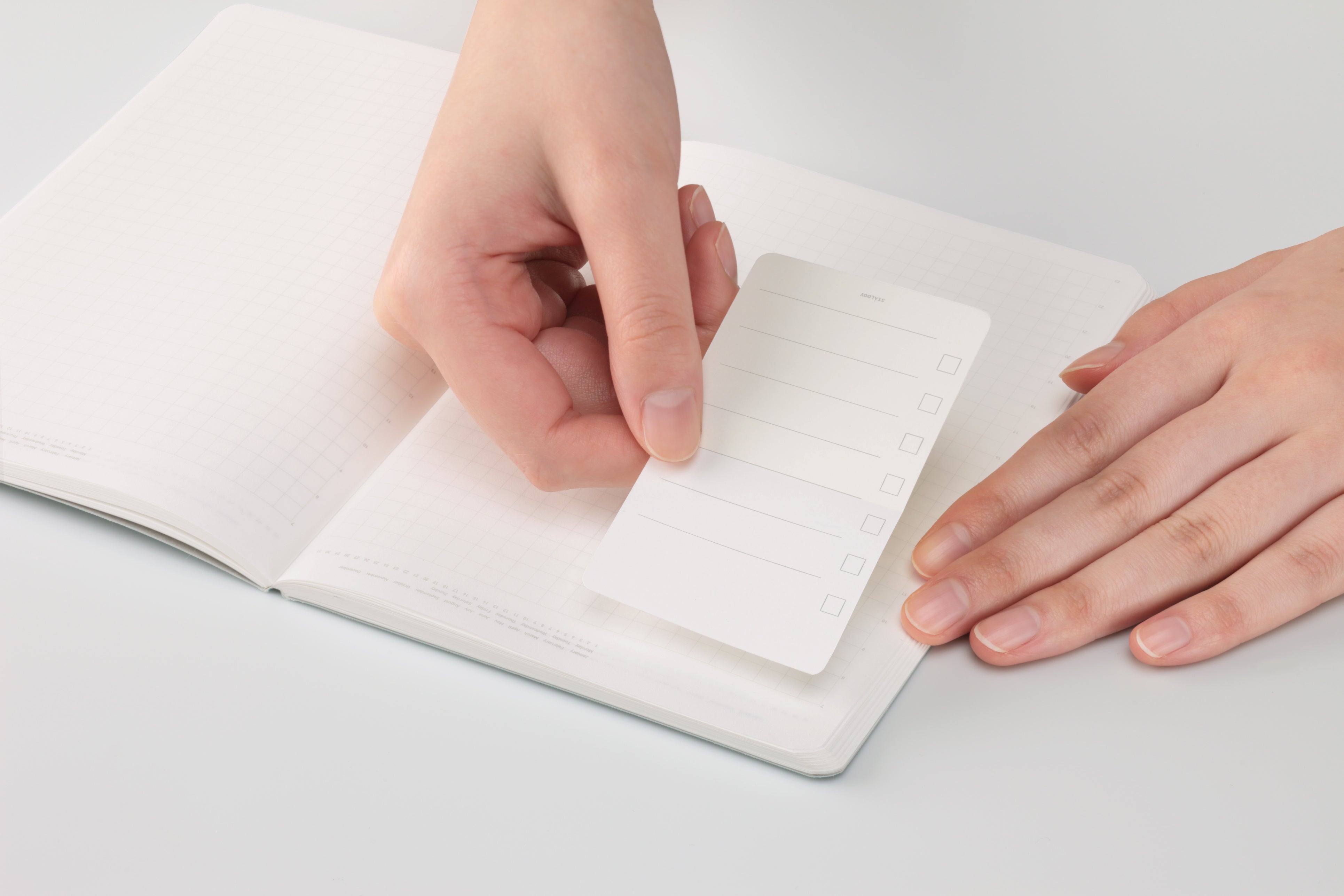 シールタイプなので、貼るだけでお手持ちのノートにタスク管理の機能を追加できます。ノート以外にも、手帳、机の上など、日々のタスク管理がしやすい場所に貼ることが可能です。全面粘着タイプでしっかりと貼ることができ、再はく離可能なのりを採用しているので、きれいにはがすことができます。そのため、自分の見やすい所に気兼ねなく貼ってタスク管理ができ、使い終わった後は、はがすことができます。角は丸く加工されており、使用時には、はがれにくく角が傷むことも防ぎます。