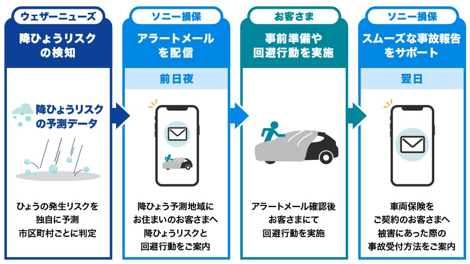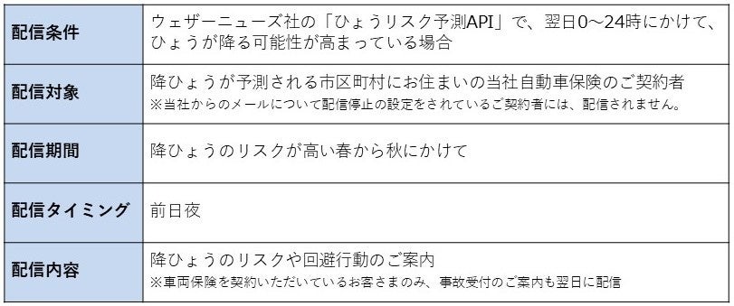 本サービスは、ウェザーニューズ社から取得する気象データ提供サービス「WxTech(R)」の「ひょうリスク予測API」の予測データをもとに、降ひょうが予測される市区町村にお住まいの自動車保険のご契約者へ前日夜にアラートメールを配信します。
