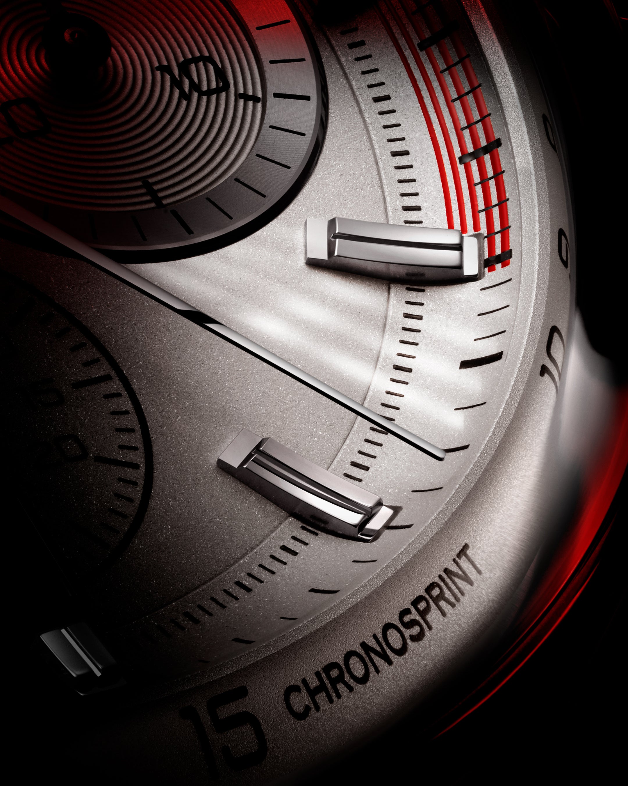 短い時間間隔を正確に計測するために設計された新型ムーブメントTH20-08を搭載したこのモデルは、ポルシェ901の0-100km/h加速を9.1秒で再現しています。センター針は素早く加速し、60秒かけて徐々に減速し、素早く再始動します。また計算されたデザインにより、文字盤の視認性が確保されています。