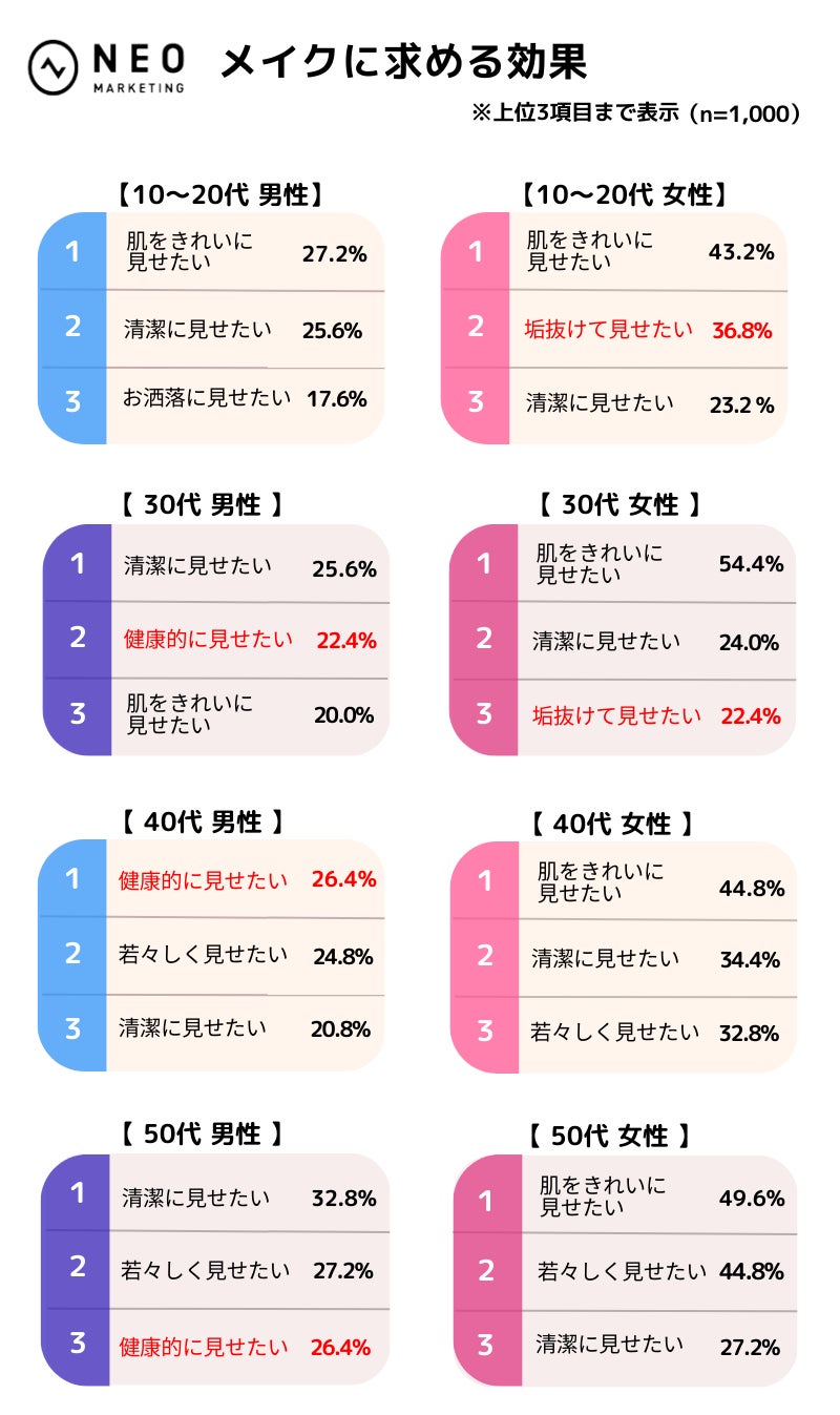 その一方で、男性は女性よりもメイクで「健康的に見せたい」という気持ちが強く、10〜20代を除きどの年代も20%強をマーク。